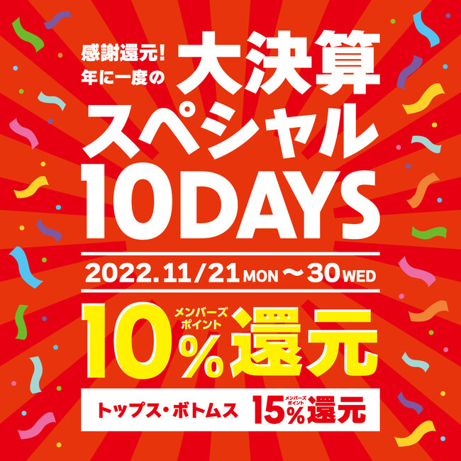 登山・クライミング・アウトドア用品総合専門店、クライミングジムを運営する株式会社好日山荘(本社:兵庫県神戸市、代表取締役社長 池田 真吾)は、11月21日(月)~11月30日(水)の10日間、好日山荘全店(フランチャイズ店含む)でメンバーズポイントが最大15%還元となる「大決算スペシャル10DAYS」を開催します。