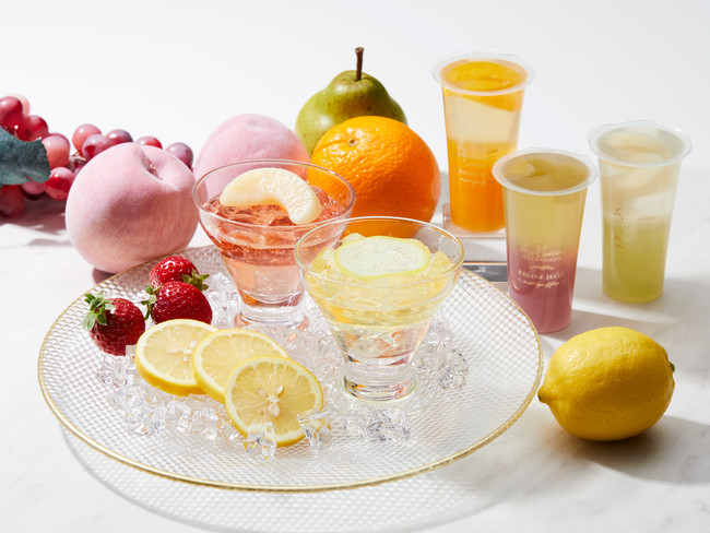 ピーチとストロベリーの2層のゼリーに白桃の果肉を入れた「ピーチ&ストロベリー」や、レモンと日向夏の2層のゼリーにレモンの果肉を入れた「レモン&日向夏」など、5種類の味わいをご用意致しました。