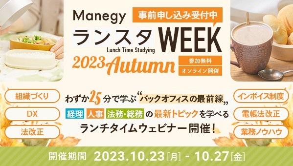 株式会社 MS-Japan(本社:東京都千代田区 代表取締役会長兼社長CEO:有本隆浩/以下 MS-Japan 証券コード:6539)が運営する管理部門と士業のためのビジネスメディア「Manegy」にて、ランチタイムに気軽に学べるオンラインイベント『第12回 ManegyランスタWEEK -2023 Autumn -』の開催に伴い、参加者の募集を開始いたしましたのでお知らせいたします。