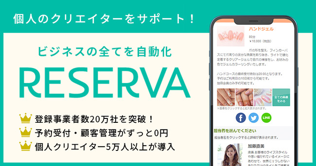 RESERVA(https://reserva.be/)は、ヘアサロン、ネイルサロン、フィットネスジム、オンラインレッスン、各種イベント・セミナーなど20万社以上で導入。個人のクリエイターもサポート!