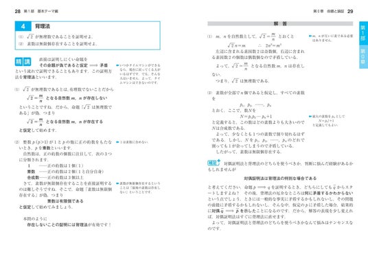 本シリーズの最大の特長は、問題と解答の間に設けた「精講」のコーナーです。ここでは、用語や記号の定義などの基本事項の確認や、問題の考え方・アプローチ方法を説明しています。問題を見ただけでは解き方が思いつかない時や、問題への理解を深めたい時に役立ちます。
