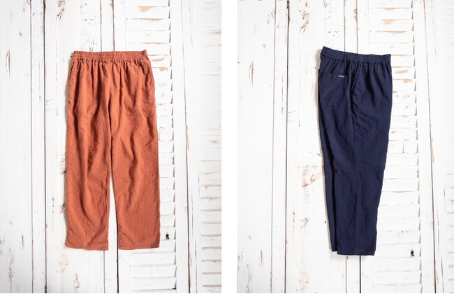 腰回りにゆとりを持たせ、裾に向けて緩やかなテーパードシルエットに仕上げました。緯糸に反毛糸(※)、経糸にリネン糸を使用。滋賀県の伝統技法から成る生地の仕上げ方法である「近江晒し加工」を施しています。染色前の生機を時間をかけて繰り返し揉み込むことで生じる洗い晒しのようなシワ感と膨らみのある風合いとなっております。