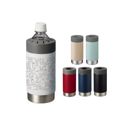 シリコンパーツを取り付けることで、ボトルホルダーとサーモタンブラーの2WAY仕様。夏は冷たいペットボトルホルダーとしても使え、通年便利です。