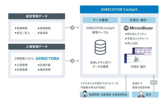 こうした実情を踏まえ、シムトップスとウイングアークは、生産管理現場のリアルなデータと経営指標を連携し、現場と経営をデータでつなぐ生産マネジメント基盤「DIRECTOR Cockpit」の提供を決定しました。