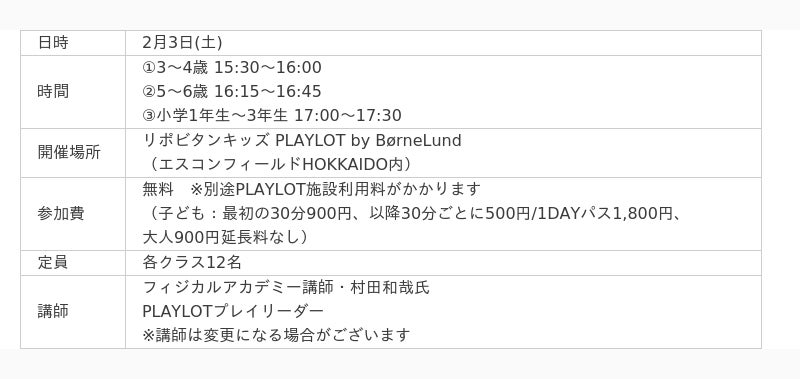 北海道日本ハムファイターズでは子どもたちの健やかな成長にあそびを通して寄与することを目的に、教育玩具の輸入販売とあそび場づくりを行う株式会社ボーネルンドと協業し、「フィジカルアカデミー FビレッジPLAYLOT校」の開校を予定しております。開校に先立ち、2月3日(土)に体験会を開催します。