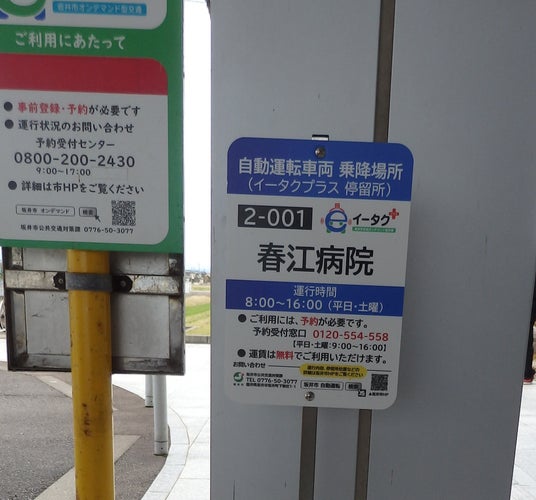 イータクと同じ事前予約(オンデマンド)制で、携帯アプリを使って簡単に予約できる。運行は日曜祝日を除く月~土曜日の午前8時~午後4時。坂井市以外の在住の人もアプリ登録すれば、試乗できる。春江支所―春江病院のルートは嶺北縦貫道など結構な交通量のある繁華街を走る。