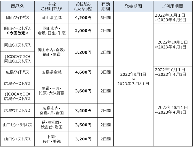・本年4月から発売しております、「(ICOCAでGO)岡山ウエストパス」「(ICOCAでGO)広島イーストパス」について、ご好評につき10月以降も継続発売いたします。お持ちのICOCAで自動改札機を利用でき、大変便利です。