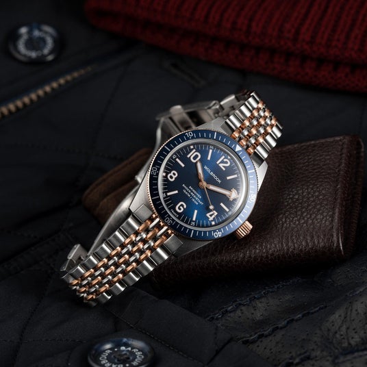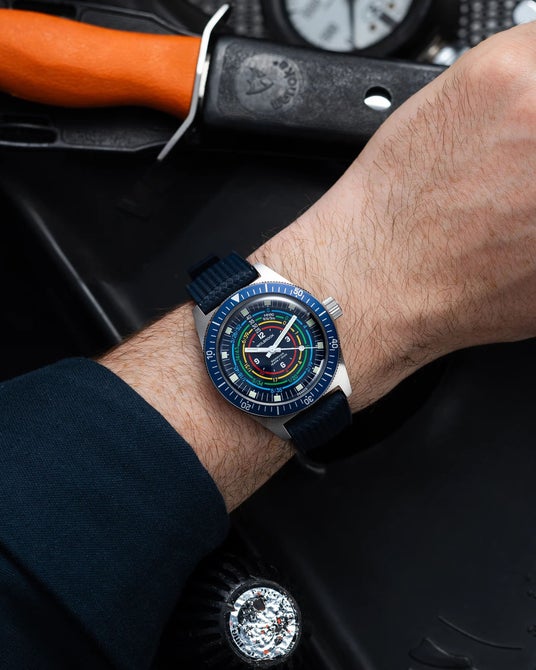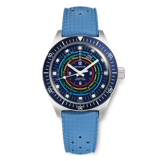 ブランドを代表するモデルが、1960年代に登場した「Skindiver(スキンダイバー)」です。ダイバーズウォッチとしての機能性を備えながら、パイロットウォッチの要素を取り入れた高い視認性のダイヤルデザインが特徴。シンプルでありながら計算されたインデックス配置やコントラストの効いた配色は、水中・陸上を問わず瞬時に時刻を読み取ることを可能にしています。また、一部モデルにはワールドタイム機能を備えるなど、当時としては先進的な機構を取り入れていた点も特徴のひとつです。用途に応じた実用性を重視する姿勢は、単なるダイバーズウォッチにとどまらない多機能ツールとしての価値を生み出しています。現行モデルでは当時のデザインを忠実に再現しつつ、サファイアクリスタルや現代的な防水性能などを備えることで、日常使いに適したスペックへとアップデートされています。