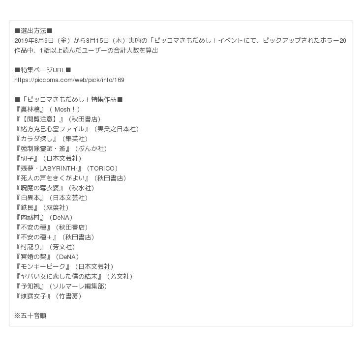 株式会社カカオジャパン(本社:東京都港区、代表取締役社長:金 在龍)は、同社が運営する電子マンガ・ノベルサービス「ピッコマ」にて、8月9日(金)~8月15日(木)に実施した「ピッコマきもだめし」イベントで、ホラー好きの読者に一番多く読まれた“最も怖い話”が決定いたしました。