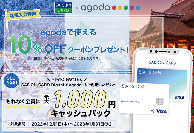 株式会社クレディセゾン(本社:東京都豊島区、代表取締役(兼)社長執行役員COO:水野克己、以下:当社)は、国内外の宿泊施設、航空券などを取り扱うオンラインプラットフォームAgoda(本社:シンガポール)利用者に向けた、スマホ完結型のクレジットカード「SAISON CARD Digital」の新規入会キャンペーンや、クレディセゾン発行のセゾンカード・UCカード会員様向け優待サービス提供を開始いたします。