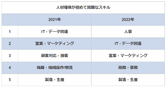 【日本の調査結果】人材確保が極めて困難なスキル: 1位 人事(前回調査結果1位 IT・データ関連)