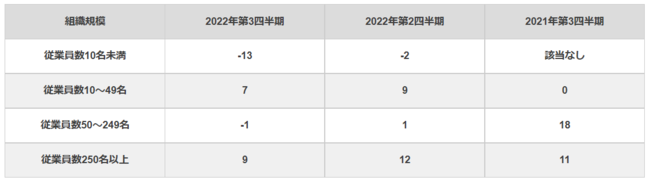 2022年第3四半期 組織規模別:従業員数10名未満、従業員数50名~249名でマイナスの予測