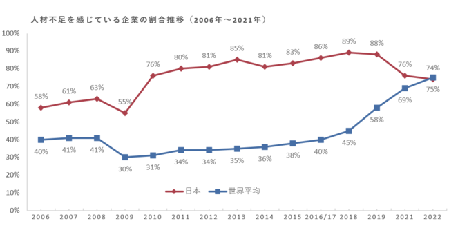 【グローバル/日本の調査結果】人材確保の難易度:世界平均69%→75%、日本76%→74%