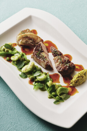豚肩ロースのグリルにはグリーンカラーが鮮やかなグリーンビーズのフリカッセをたっぷりとそえて。コンディメントのグリーンマスタードがキリっと味を引き締めます。