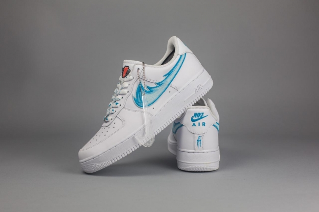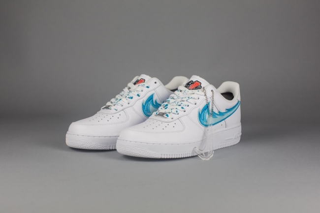 今回発売された「DRAGON BREATH ICE AF1 LOW WHT」は、ブルーを基調としたファイアーパターンをAF1に組み込んだ一足。今後、同デザインのスウォッシュを使用した数多くの新作がスタンバイしており、STILLALIVEの新たな定番デザインとして展開されていく予定となっています。そんな記念すべき第一弾は定番のAF1をベースに製作。シューレースとヒール部分のサインはスカイブルーの塗料を用いて仕上げました。