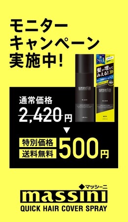 マッシーニをより多くの人に体験していただくため、数量限定のモニターキャンペーンを実施いたします。キャンペーン期間中、数量限定で「マッシーニ クイックヘアカバースプレー ブラック」を500円(税込)でお試しいただけます。通常2,420円(税込)ですが、送料無料・500円(税込)の特別価格でお試しいただけるチャンスです。