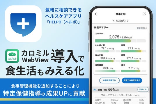 食事・運動・体重管理アプリケーション(以下アプリ)「カロミル」の開発・提供をするライフログテクノロジー株式会社(東京都中央区、代表取締役:棚橋繁行、以下当社)が提供する「カロミルWebView」が、ヘルスケアテクノロジーズ株式会社(本社:東京都港区、代表取締役社長 CEO:鴻池 大介)が提供する「HELPO(ヘルポ)遠隔特定保健指導サービス」内のサポート管理アプリに導入され、2025年4月22日より食事管理機能の提供が開始されたことをお知らせします。本機能の導入により、「HELPO遠隔特定保健指導サービス」の利用者は、日々の食事を簡単に記録・可視化できるようになり、生活習慣の改善や行動変容をよりスムーズに実現することが可能となります。また、ユーザーの“高精度な食生活データ”を継続的に取得・分析するための基盤としても活用ができます。
