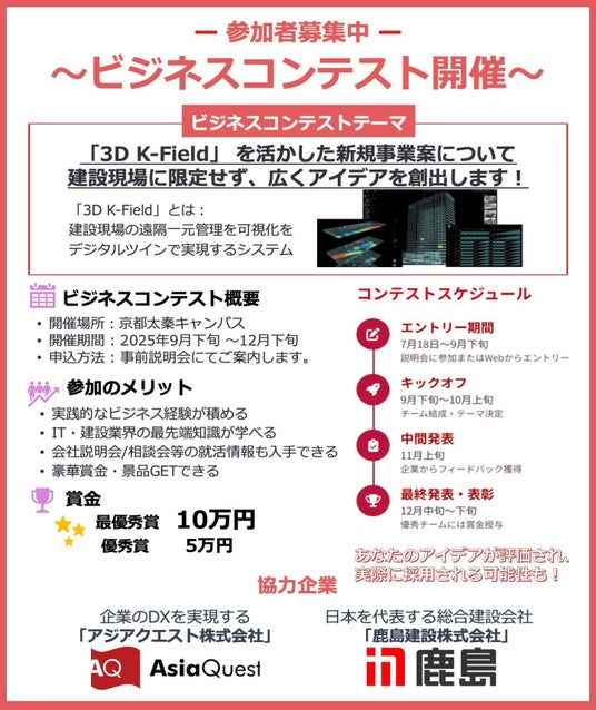 アジアクエスト株式会社(本社:東京都文京区、以下 アジアクエスト)は、京都先端科学大学(以下 KUAS)と共同でビジネスコンテストを開催しました。KUAS工学部の学生とアジアクエスト社員がチームを組み、デジタルツインを活用した建設DXソリューションの「3D K-Field」を題材に、建築業界にとどまらない企業の新規事業の創出と提案に取り組みました。次世代を担うDX人材の実践的な育成を目的としています。