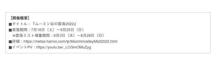 「ムーミンバレーパーク」公式Twitter :https://twitter.com/metsamvp_info