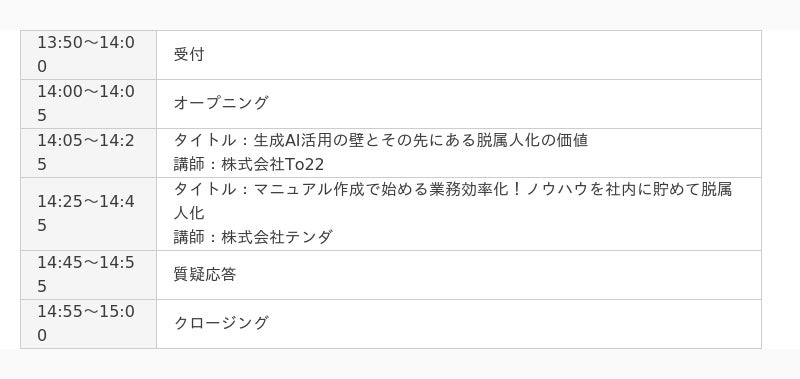 マニュアルトータルソリューションを提供する株式会社テンダ(本社/東京都渋谷区、代表取締役会長/小林 謙、以下「テンダ」)は、株式会社To22 (本社/東京都中央区、代表取締役社長/野間 康平、以下「To22」)と、2025年1月22日(水)に「生成AIとシステム化で実現する業務の脱属人化 ~ノウハウを社内に水のように浸透させる方法~」と題し、共催ウェビナー(事前登録制・参加無料)を開催いたします。