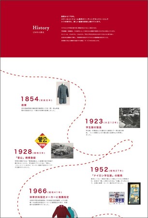創業から170年、1854年の綿糸の卸業から始まり、1923年に学生服の一貫生産を開始しました。1928年には、現在の社名の由来となっている「菅公」ブランドの商標登録、1952年には「ナイロン学生服」の販売など、スクールユニフォーム業界のリーディングカンパニーとしての歩みを紹介しています。