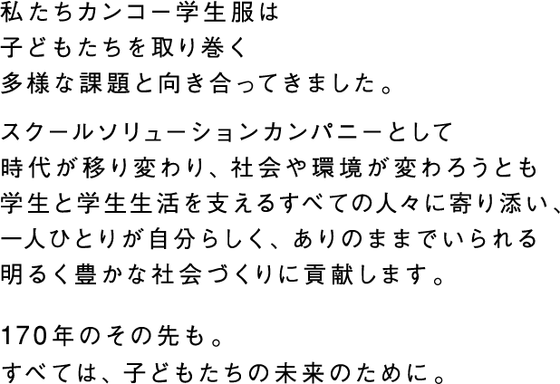 どんなに時代が移り変わり、社会や環境が変わろうとも、学生と学生生活を支えるすべての「人」に寄り添い、エールを送り続ける想いをカンコー学生服の「170」年の歴史に重ねて、未来を感じるデジタルフォントで表現したデザインです。