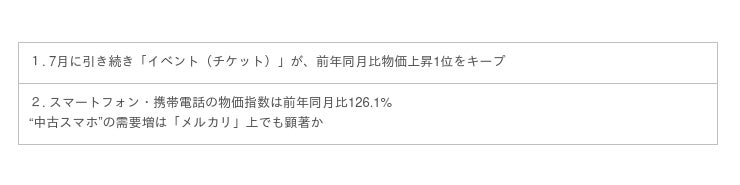 8月のメルカリ物価指数の傾向を見ると、前年同月比100%割れのカテゴリーが8カテゴリーのみと言うことは、二次流通市場の価格にもインフレの影響が出ている可能性が読み取れます。