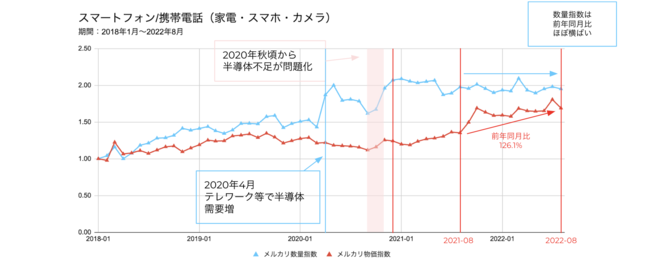 また、ピックアップした「スマートフォン/携帯電話」に関しては中古スマホは半導体不足の影響を受け、一部では新品価格を上回ることもあると言われており、「メルカリ」上でも影響を受けていることを示唆しています。