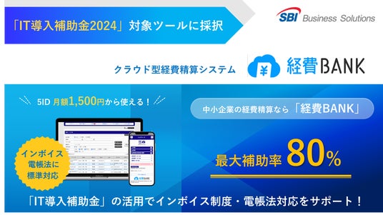 総合フィンテックソリューション企業であるSBI FinTech Solutions株式会社の子会社で、バックオフィス支援サービスを提供するSBIビジネス・ソリューションズ株式会社(本社:東京都港区、代表取締役社長:夏川 雅貴、以下「当社」)は、経済産業省・中小企業庁が推進する「IT導入補助金2024」の「通常枠」及び「インボイス枠(インボイス対応類型)」において、今年も「IT導入支援事業者」として認定され、当社が提供するクラウド型経費精算システム「経費BANK」が補助対象ツールとして採択されましたので、お知らせいたします。
