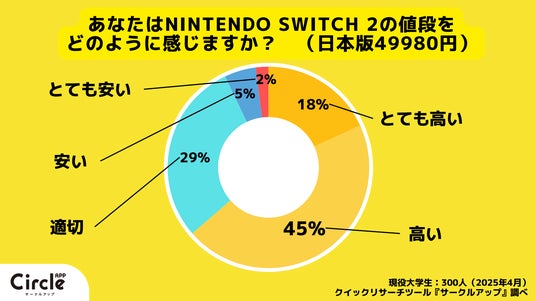あなたはNintendo Switch 2の値段をどのように感じますか? (日本版49,980円)という質問に対し、とても高いと回答した人は18%、高いと回答した人は45%、適切だと回答した人は29%、安いと回答した人は5%、とても安いと回答した人は2%でした。