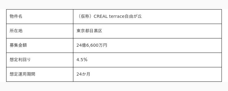 クリアル株式会社(代表取締役社長:横田 大造、以下、「当社」)は、不動産ファンドオンラインマーケット「CREAL(クリアル)」で募集した、東京都目黒区自由が丘に所在する商業施設ファンド(以下、「本ファンド」)への投資申込を、2024年1月12日をもって満額申込のため受付を終了したことをお知らせします。