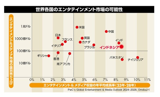 世界4大コンサルタント会社の1つであるPwCの調査によると、インドネシアのエンタテインメント市場は、23年から28年にかけて年平均8.5%の成長率が見込まれており、100億ドル(約1兆4000億円)を超えるマーケットに成長すると予測されています。