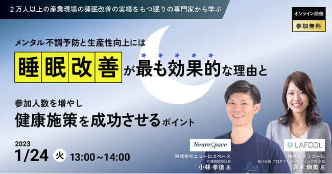 「個人が変われば、 組織が変わる」組織改善サーベイ「ラフールサーベイ」を提供するウェルビーイング/人的資本経営支援の株式会社ラフール(本社:東京都中央区、代表取締役社長:結木啓太、以下「ラフール」)は株式会社ニューロスペース(本社:東京都墨田区、代表取締役社長CEO:小林孝徳、以下「ニューロスペース社」)と『2万人以上の産業現場の睡眠改善の実績をもつ眠りの専門家から学ぶ ~メンタル不調予防と生産性向上には睡眠改善が最も効果的な理由と参加人数を増やし健康施策を成功させるポイント~』をテーマとしたオンラインセミナーを2023年1月24日(火)に開催します。