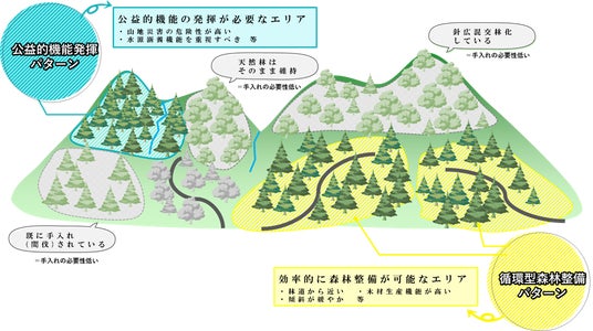 本市では、上記の『森林経営管理制度』の枠組みの中で、特に効率的に森林整備が可能なエリアを中心に、循環型森林整備を進めます。