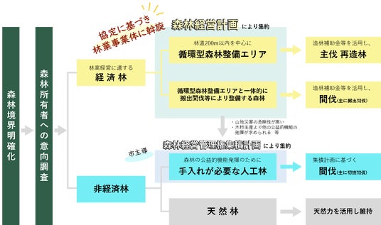 このように、森林整備の実績とノウハウを有する林業事業体と協定を締結し、市が『自身では管理ができない』という意向を持つ所有者の森林をまとめ、事業体に情報共有・斡旋する仕組みを整えるとともに、主伐・再造林と一体的に森林整備を実施できるエリアを森林経営計画(※)としてまとめ、面的にまとまりをもった効果的・効率的な森林整備を行っていくことで、木材の循環利用の実現、手入れ不足の人工林の解消と森林の有する多面的機能の向上、森林整備のスピードアップ、森林所有者の負担・不安軽減など、現在の森林・林業を取り巻く様々な課題の解決に繋げます。