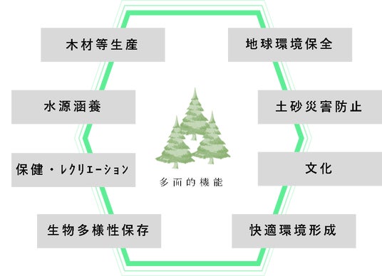 森林は、私たちに木材を供給してくれるだけでなく、二酸化炭素を吸収する、水を貯留し洪水を緩和する、土砂の流出を防ぐ、川や海へ養分を供給する、多様な生物を育む、風景や安らぎを与えるなど、さまざまな機能を有しており、これらを総称し『森林の有する多面的機能』と呼ばれています。
