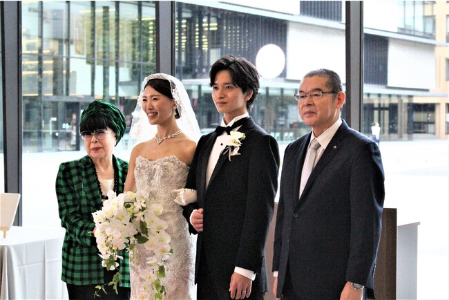 全日本ブライダル協会会長の桂由美氏による「ブライダルの歴史」についてのご講話を第1回の授業として、その後は三上弥貴子理事らとともに「生涯未婚率の上昇」「結婚式場以外の場所の活用」などを学生が自ら調査・分析し、ウェディングの実情や展開を踏まえ、プロから挙式のプロデュース方法を実地で学びました。イベント当日は、学生が担当業務をこなしながら臨機応変にトラブルに対応し、新郎新婦や参列者に寄り添った会場づくりを心がけるなど、本授業での学びの集大成としました。また、司式者は高橋学長が務め、全日本ブライダル協会の桂由美会長には祝辞や学生が企画・運営したウェディングイベントへの講評をいただきました。