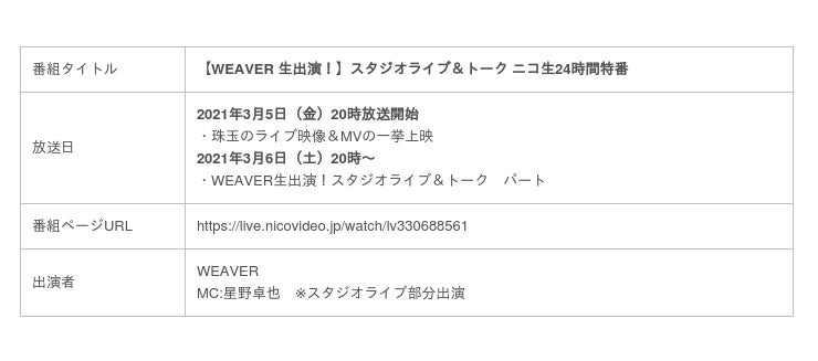 その後翌3月6日(土)20時には、WEAVERが生出演し、この日だけのスタジオライブをお届けする。