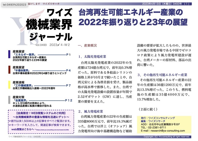 ワイズコンサルティング グループ(本社:中華民国台北市、代表取締役:吉本康志)は台湾機械業界専門誌「ワイズ機械業界ジャーナル」の2023年4月第2週号を発行しました。今週号ではエネルギー業界、半導体業界、工作機械業界と金属業界の動向を紹介します。