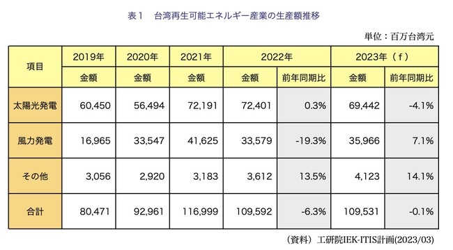 台湾風力発電産業の23年通年の生産額は前年比7.1%増の359億7000万元となる見通しだ。中国でゼロコロナ政策が大幅緩和されたことで、同国の風力発電機向け▽ブレード用樹脂、▽鋳造部品、▽線材などの出荷増が期待できるほか、台湾で25年時点の設備容量目標達成に向け、工事が遅れている洋上風力発電所の開発が加速し、補助設備や部品の需要が拡大すると予想される。
