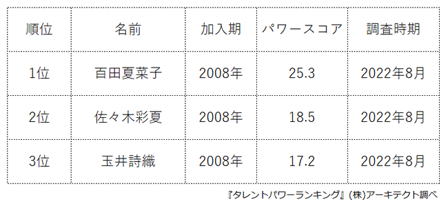 『タレントパワーランキング』では、タレントパワーランキングに登録されているももいろクローバーZ歴代メンバーのパワースコアを調査。