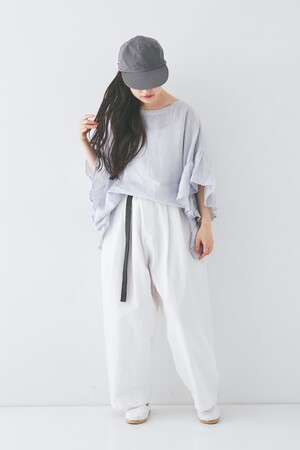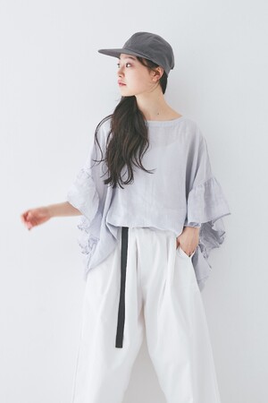 袖口の施したフリルがポイントのTブラウス。程良い透け感が涼やかな薄手のリネン素材を使用。