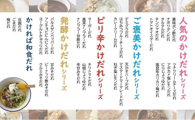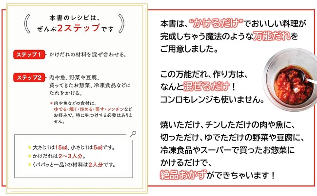 そこで本書は、“かけるだけ”でおいしくなってしまう「かけだれ」を紹介します。作り方は、なんと、混ぜるだけ。