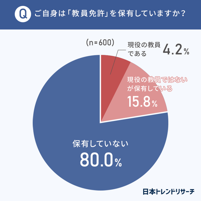 「現役の教員である」という方は4.2%、「現役の教員ではないが保有している」という方は15.8%、「保有していない」方は80.0%でした。