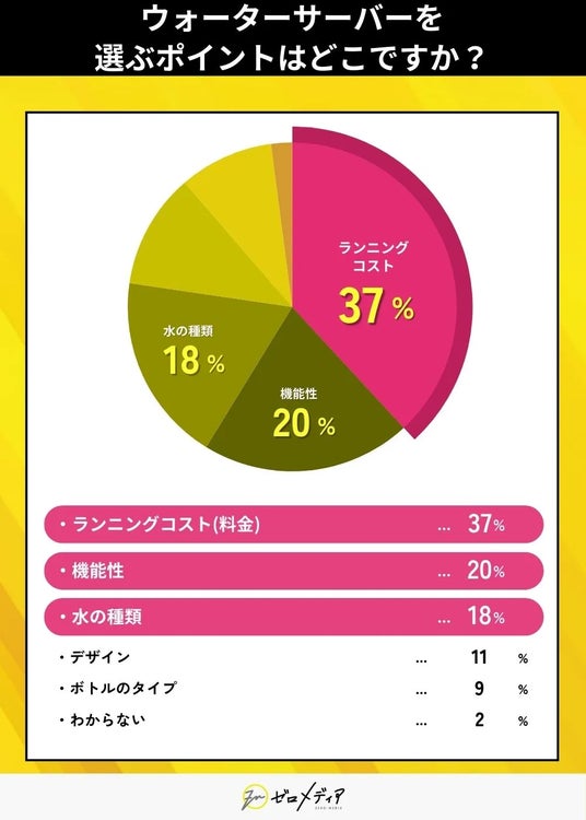 - ウォーターサーバーを選ぶうえで重要視されているのは、ランニングコスト(料金)である。