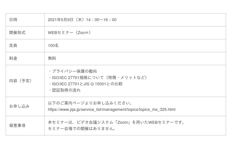 一般財団法人日本品質保証機構(JQA)は、2021年5月6日(木)にZoomを用いた無料WEBセミナー「ISO/IEC 27701入門セミナー」を開催いたします。