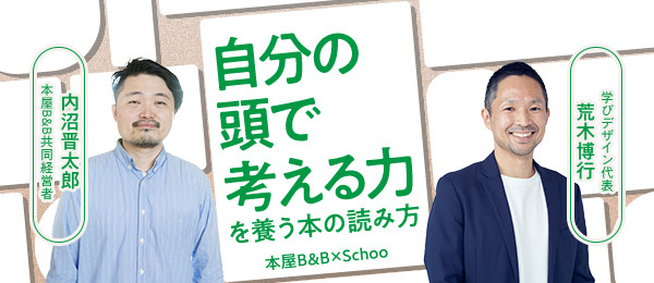 この授業では、今年『自分の頭で考える読書』を刊行した荒木博行さんと、本屋B&Bの共同経営者である、ブックコーディネーターの内沼晋太郎さんとともに、「自分の頭で考える力」を養う本の読み方について考えていきます。