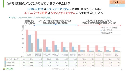 アンケートで「現在の美容意識」の度合いを聞いたところ、Z世代は関心層が71.9%と、美容への関心が上の世代よりも高いことがわかりました。一方で、「自分なりにこだわりやセルフブランディングに向けてアイテムを使っている」「美容が習慣化し、日々のルーティンとなっている」と回答した「エキスパート層」の割合はミレニアル世代と大きな差が無く、関心はあるものの、美容を日常的に実践しているZ世代男性はまだ少ないことがうかがえます。