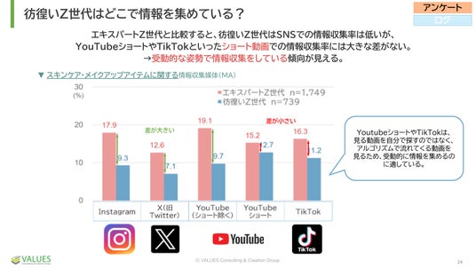 すると、「エキスパートZ世代」と比べて「彷徨いZ世代」は、InstagramやX(旧Twitter)、YouTube(ショートを除く)などのSNSでの情報収集率が低い一方、YouTubeショートやTikTokでの情報収集率には両セグメントで大きな差がないことがわかりました。これらのショート動画媒体は、観たい動画を自分で探すよりも、アルゴリズムで流れてくる動画を視聴するスタイルが主流です。このことから「彷徨いZ世代」は、受動的に美容に関する情報を得る傾向にあると考えられます。