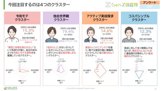 レポートでは、美容無関心層である「無頓着クラスター」以外の、「令和モテクラスター」「独自世界観クラスター」「アクティブ美容探求クラスター」「コスパシンプルクラスター」それぞれについて、人となりや行動実態を深掘り分析しています。